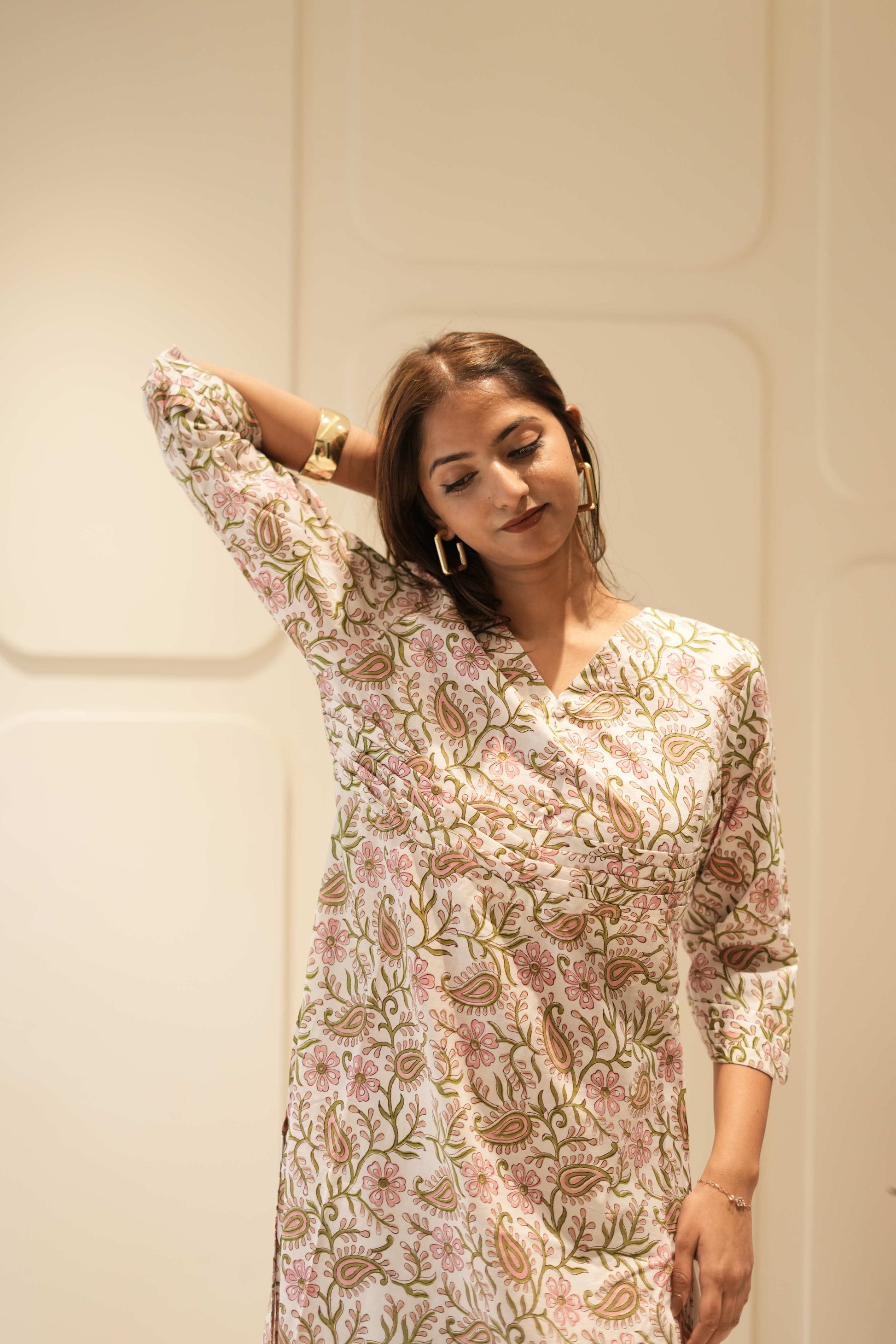 This printed A-line kurta features a flattering empire waist that gently flows into a graceful silhouette. Designed for all-day comfort, it is crafted in breathable fabric and finished with a classic neckline and three-quarter sleeves. The soft flare adds ease of movement while maintaining a refined, elegant look.